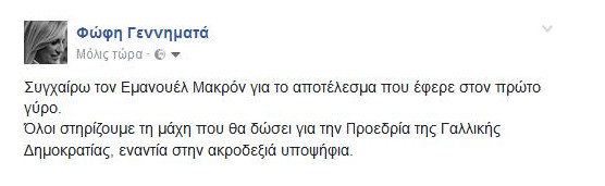 Με ανάρτησή της στα social media η πρόεδρος του ΠΑΣΟΚ και Επικεφαλής της Δημοκρατικής Συμπαράταξης Φώφη Γεννηματά, σχολίασε για το αποτέλεσμα του α’ γύρου των γαλλικών προεδρικών εκλογών