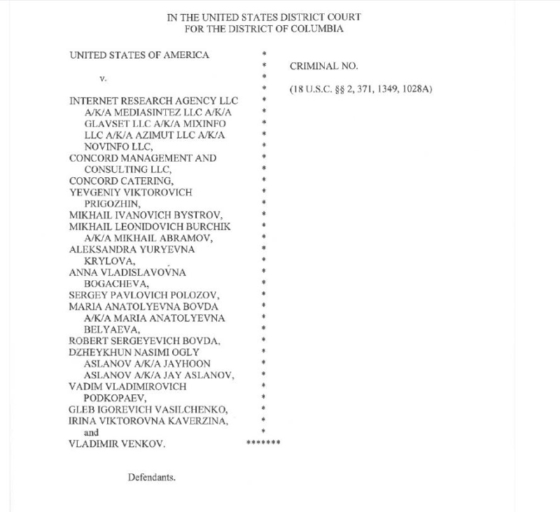Κατηγορίες σε βάρος 13 Ρώσων για παρεμβάσεις στις αμερικανικές προεδρικές εκλογές του 2016 απήγγειλε ο ειδικός σύμβουλος που ερευνά την υπόθεση Ρόμπερτ Μούλερ. Σύμφωνα με την ανακοίνωση αυτή, τα πρόσωπα και οι οντότητες αυτές κατηγορούνται για συνωμοσία με στόχο την εξαπάτηση των Ηνωμένων Πολιτειών. Τρεις από τους υπόπτους κατηγορούνται για συνωμοσία για τη διάπραξη απάτης μέσω διαδικτύου ή τηλεφώνου και για τραπεζική απάτη και άλλοι πέντε για διακεκριμένη κλοπή ταυτότητας.