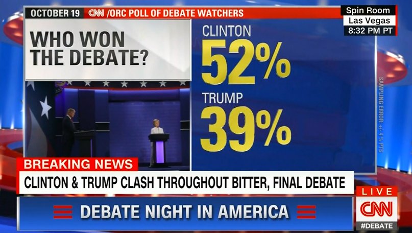 Σύμφωνα με δημοσκόπηση του CNN, νικητή της τηλεμαχίας θεώρησε τον κ. Ντόναλντ Τραμπ μόλις το 39% των ερωτηθέντων. Η δημοσκόπηση του αμερικανικού τηλεοπτικού δικτύου πραγματοποιήθηκε αμέσως μετά τη λήξη του ντιμπέιτ.