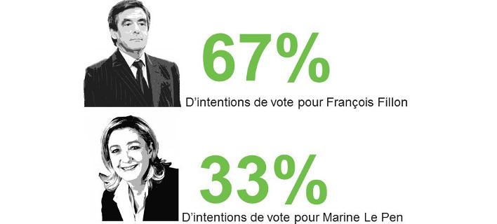Σύμφωνα με την δημοσκόπηση από το Harris poll που αναμετέδωσε το @EuropeElects ο Φιγιόν θα επικρατούσε της κ. Μαρίν Λεπέν στις προεδρικές εκλογές του 2017. Σύμφωνα με την μέτρηση, ο κ. Φιγιόν συγκεντρώνει 67% έναντι 33% της κ. Λεπέν.