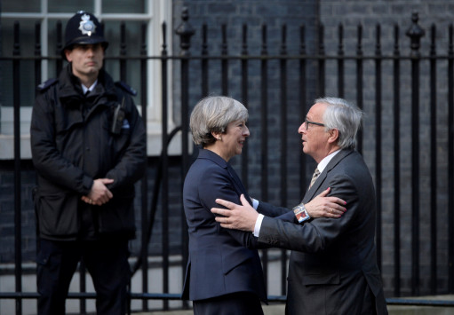 Η Μέι παρέθεσε δείπνο στον Γιούνκερ και στον επικεφαλής διαπραγματευτή της ΕΕ για το Brexit, τον Μισέλ Μπαρνιέ, στην επίσημη κατοικία της στη Ντάουνινγκ Στριτ.