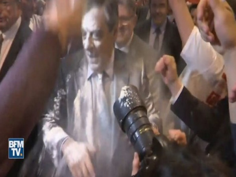 Σύμφωνα με πληροφορίες του BFMTV, λίγο πριν αρχίσει η ομιλία του υποψηφίου προέδρου της Γαλλίας, ένας νεαρός που φορούσε μια μπλούζα με σύνθημα "οι νέοι με τον Φιγιόν", του πέταξε αλεύρι!