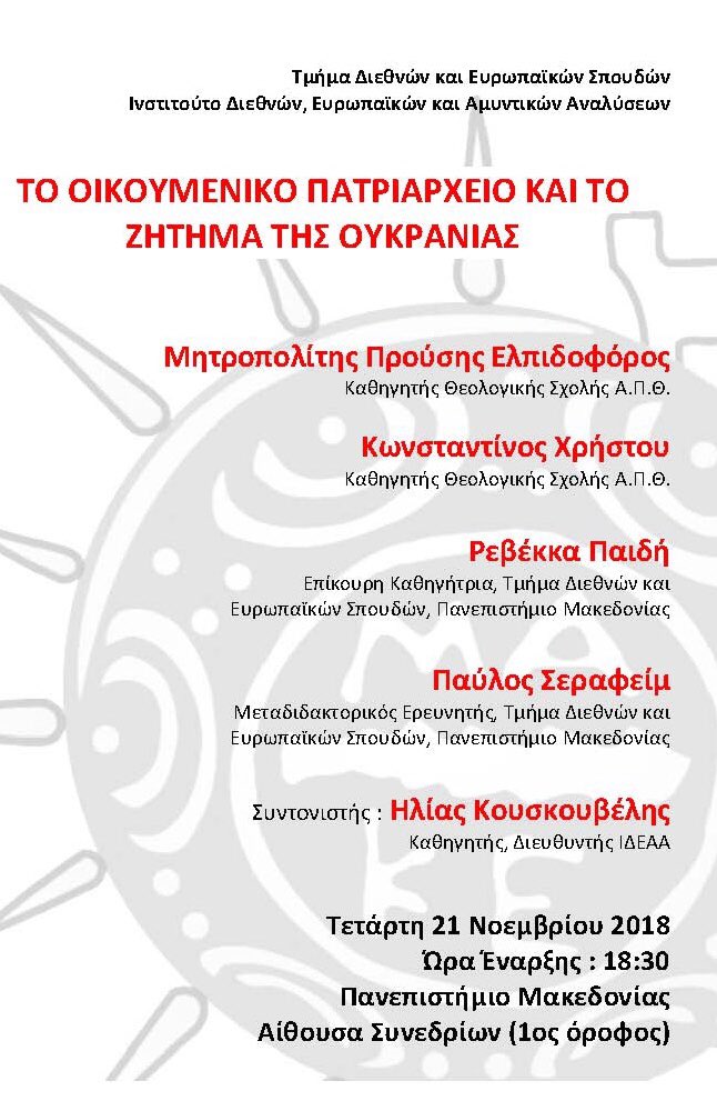 Πανεπιστήμιο Μακεδονίας - Τμήμα Διεθνών και Ευρωπαϊκών Σπουδών: Εκδήλωση με Θέμα ''Το Οικουμενικό Πατριαρχείο και Ουκρανικό Ζήτημα''